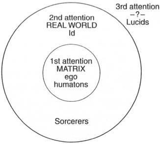 The 1st attention pertains to the matrix, the world of reason and of the intellect. It is everything that can be rationally grasped, explained, and understood (also known as the tonal). The mastery of the 1st attention is known as stalking. The world of ordinary men is upheld by reason, the world of sorcerers by will. Ordinary men have a single ring of power that spins the world into being, which we call reason. Sorcerers tap into a second ring of power, that of will.