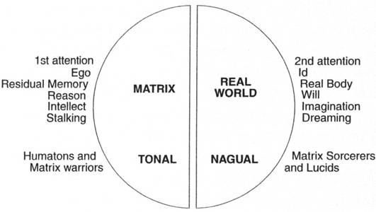 The 2nd attention pertains to the real world, that ruled by the will, the imagination. It is everything that cannot be understood rationally but only grasped intuitively, through feeling; it is everything that cannot be talked about, only experienced (it is also known as the nagual). The 2nd attention is accessed through the art of dreaming; as such, it is experienced by humatons only while deep asleep, by matrix warriors in a limited capacity through their dreams, and by matrix sorcerers who have fully unplugged and so mastered the art of dreaming (i.e., existing in two places at once).