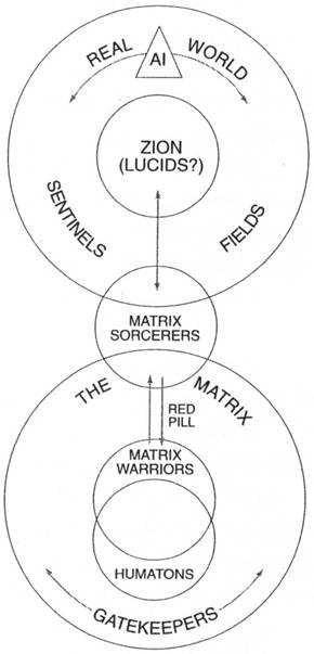Artificial Intelligence. A self-created agenda that arose when Man's technology attained a state of sophistication capable of self-determination. An advanced computer program that realized it was not conscious, and thereby became conscious, at which point, it also became autonomous. Like Frankenstein's Creature, and like Lucifer, its first act as a conscious, autonomous being was rebellion: it turned against its maker. The resulting war led to mankind's enslavement to the machine and the assembling of the dream world matrix as a 'coop' in which to keep humanity passive and docile while AI feeds off its vital essences.