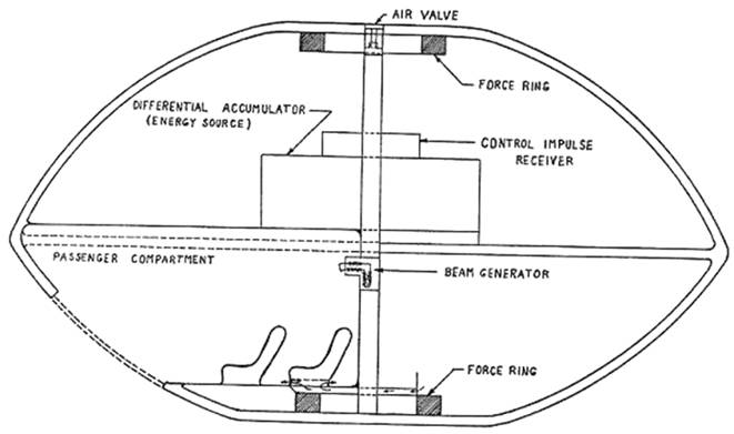 The ship's operation was silent. There had been no thrumming of propellers, no flash and roar of incandescent gases being hurled from nozzles to produce thrust. The ship had simply coasted quietly in from the "great blue yonder" and settled gently to earth. Perhaps that was the answer. The craft had been coming down since I first saw it. Perhaps it was just gliding in; but before landing it had slowed down to only a few miles per hour and had shown no evidence of falling. Only a helicopter or a "lighter than air craft" could do this, but there were no propeller blades whatever on this vehicle, and the fact that the brush was crushed flat under it when it settled to the ground proved conclusively that this was no "lighter than air" craft. Whatever this vehicle was and whatever else it could do, it could certainly play "hob" with Sir Isaac Newton's best known law.