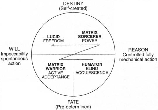 The means by which the matrix warrior escapes the matrix and becomes a matrix sorcerer is by tapping his or her will. The 2nd attention or real world is the world upheld by will, or creative imagination. Morpheus helps Neo to tap his sorcerer's will by telling him to free his mind and forcing him to attempt impossible acts, forcing him to believe. It is through will that the matrix sorcerer shapes his circumstances and turns them to his advantage. When his will is a fully functioning unit, he is ready to make the leap of imagination and to see the code, thereby becoming Lucid.