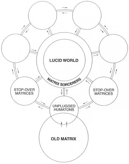 The reign of the matrix, the 'flyers' mind', (see Appendix Two) is so pervasive and unchallenged that it is impossible for most of us to even think about it, much less confront it. Since we have no control over our own thoughts, any time the notion of the matrix's existence arises in us, it is immediately shot down by a barrage of counter-thoughts arising from the matrix-mind itself. Hence, the only means for this knowledge to surface at a more conscious level (apart from in work such as Castaneda's) is in the form of sci-fi, fantasy and horror fiction. This way, men and women are at least given the option of glimpsing the true nature of their predicament, of confronting their lurking, unconscious, visceral fears, and arriving at the truth. The hold of the matrix is by definition a tenuous hold: it is its very weakness that makes it so tyrannical. Only so far as we acquiesce to its commands and feed the affinity that exists within ourselves for oblivion can it continue to maintain its hold over us. On the other hand, the option of overcoming the tyranny of this predatory matrix is open to all, and is indeed the true nature of the beast: that of an unspoken challenge.