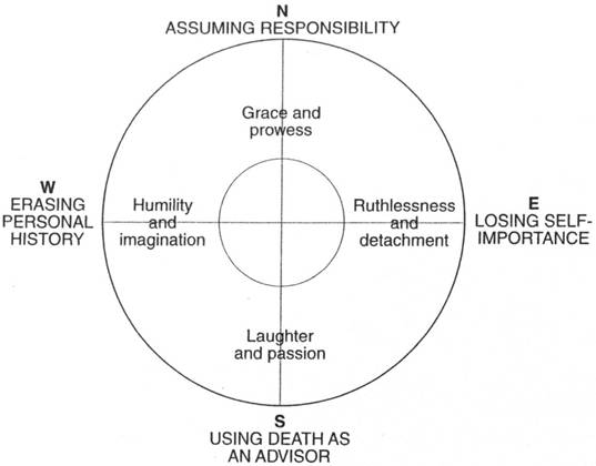 For those interested, the warrior's path of knowledge is not a spiritual path but a wholly practical one. It involves specific but flexible disciplines, abstract procedures rather than fixed steps, all of which are directed towards enabling the warrior to perceive energy directly. Losing self-importance, erasing personal history, assuming responsibility for one's thoughts and actions, and using death as an advisor ate the four central tenets of the warrior's way.